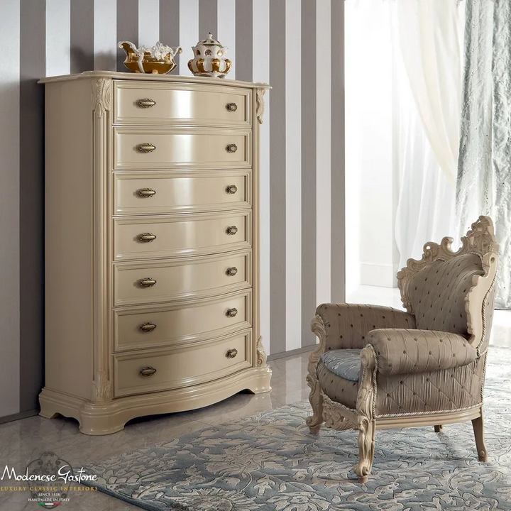 Dieser Sessel verkörpert den Barockstil, der sich durch seine aufwendigen Details und reichen Texturen auszeichnet. Die Mischung aus traditionellen und modernen Elementen schafft eine einzigartige visuelle Anziehungskraft, die es dem Sessel ermöglicht, nahtlos in sowohl klassische als auch zeitgenössische Umgebungen zu passen. Sein Design spiegelt den Glanz der Vergangenheit wider, während es modernen Geschmäckern gerecht wird, und macht ihn zu einem zeitlosen Stück.