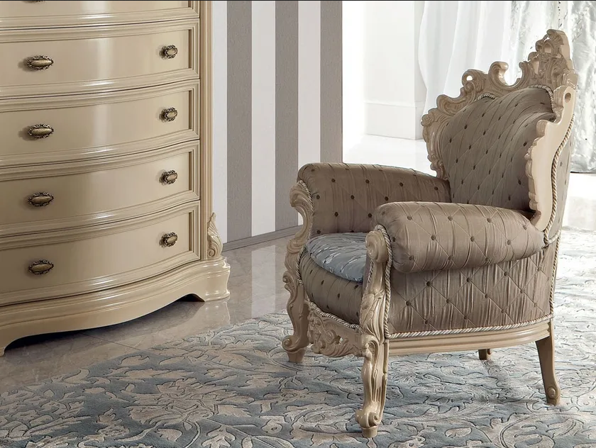 Der gepolsterte Sessel ist mit akribischer Liebe zum Detail gestaltet und verfügt über elegante Linien und plüschige Polsterung, die zum Komfort einladen. Dekorative Elemente wie gepolsterte Polsterung und aufwendige Schnitzereien erhöhen den ästhetischen Wert. Das Gesamtbild strahlt raffinierte Luxus aus und sorgt dafür, dass dieser Sessel in jedem Raum, den er einnimmt, zum Blickfang wird.